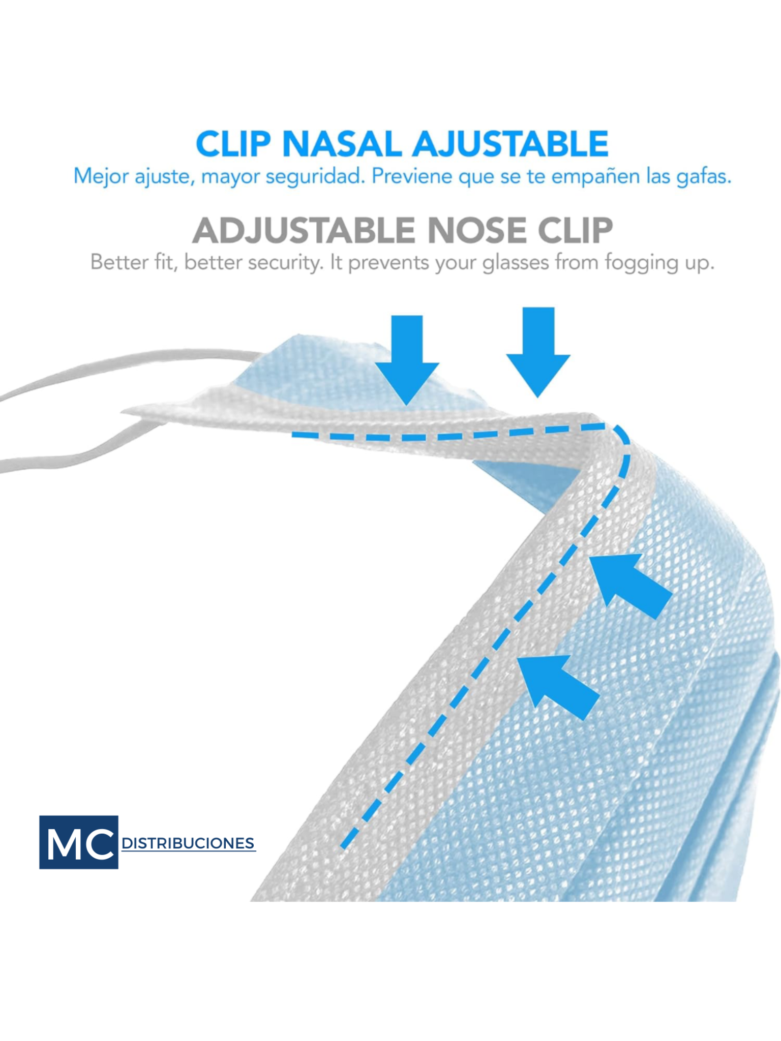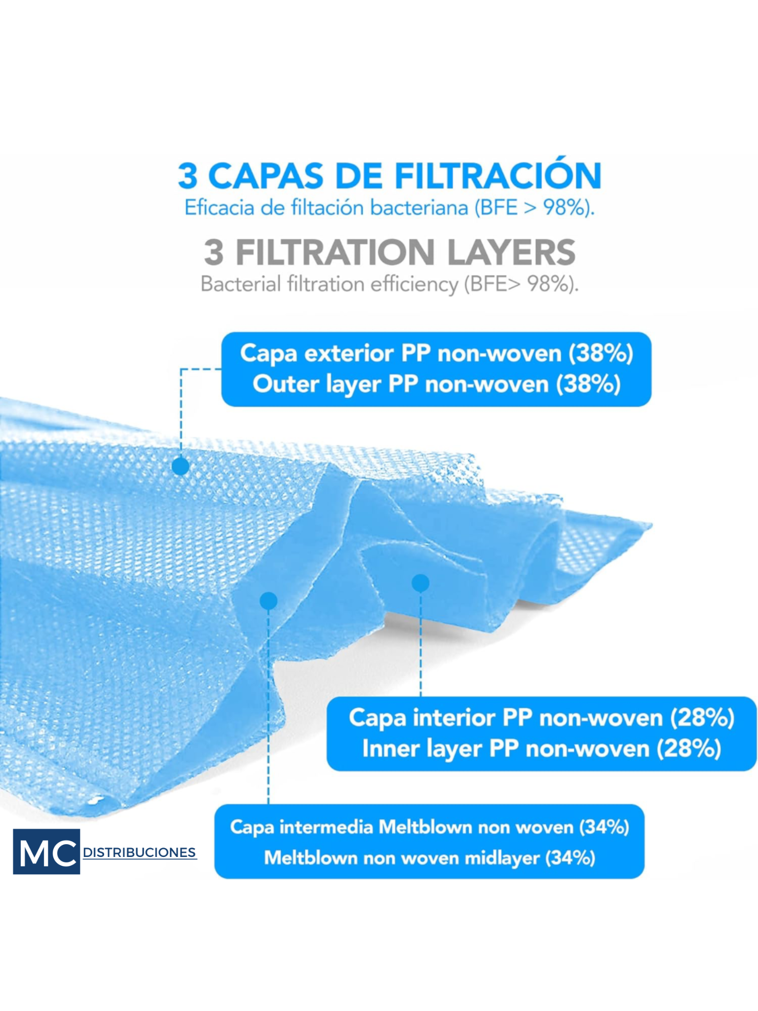 Tapabocas de polipropileno rectangular, con tres pliegues que provocan un mejor acople anatómico, con elástico de ajuste para sujetar por detrás de las orejas y con filtro protector.